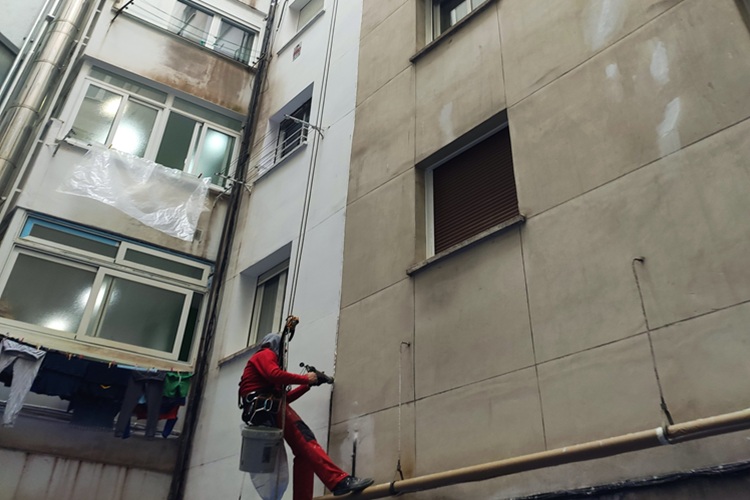 Picado de fisuras y mortero hasta llegar a la base firme, aplicación de mortero de reparación, regularización de toda la superficie con fratasado fino. Imprimación y dos manos de pintura petrea transpirable de exteriores. Rejillas de ventilación. Fijación de tendederos.