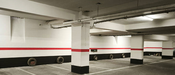 Saneado y picado de paramentos verticales y horizontales de garaje. Con posterior pintuta en tres colores típica de garajes. Reparación de humedades con apliacación de mortero antihumedad
