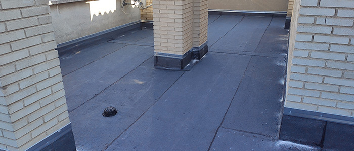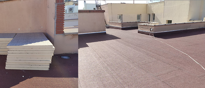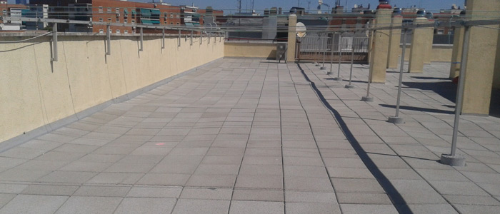 Formación de pendientes mediante capa de arcilla expandida en seco con mortero de cemento y arena de río M-5 aligerado con arlita G-3 de entre 4 y 6 cms de espesor medio. Aplicación de sistema bicapa de impermeabilización vista. Primera lámina asfáltica elastomerica y Segunda lámina elastomerica con acabado en granulo mineral.
