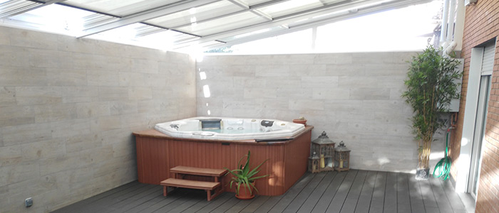 Ver másRehabilitación de terraza para adecuar el espacio a nueva funcionalidad. Carramiento de techo eléctrico. Solado de tarima. Instalación fontanería para Jacucci. Paramentos verticales con trasdosado y pintura anti-humedad. Electricidad e iluminación.